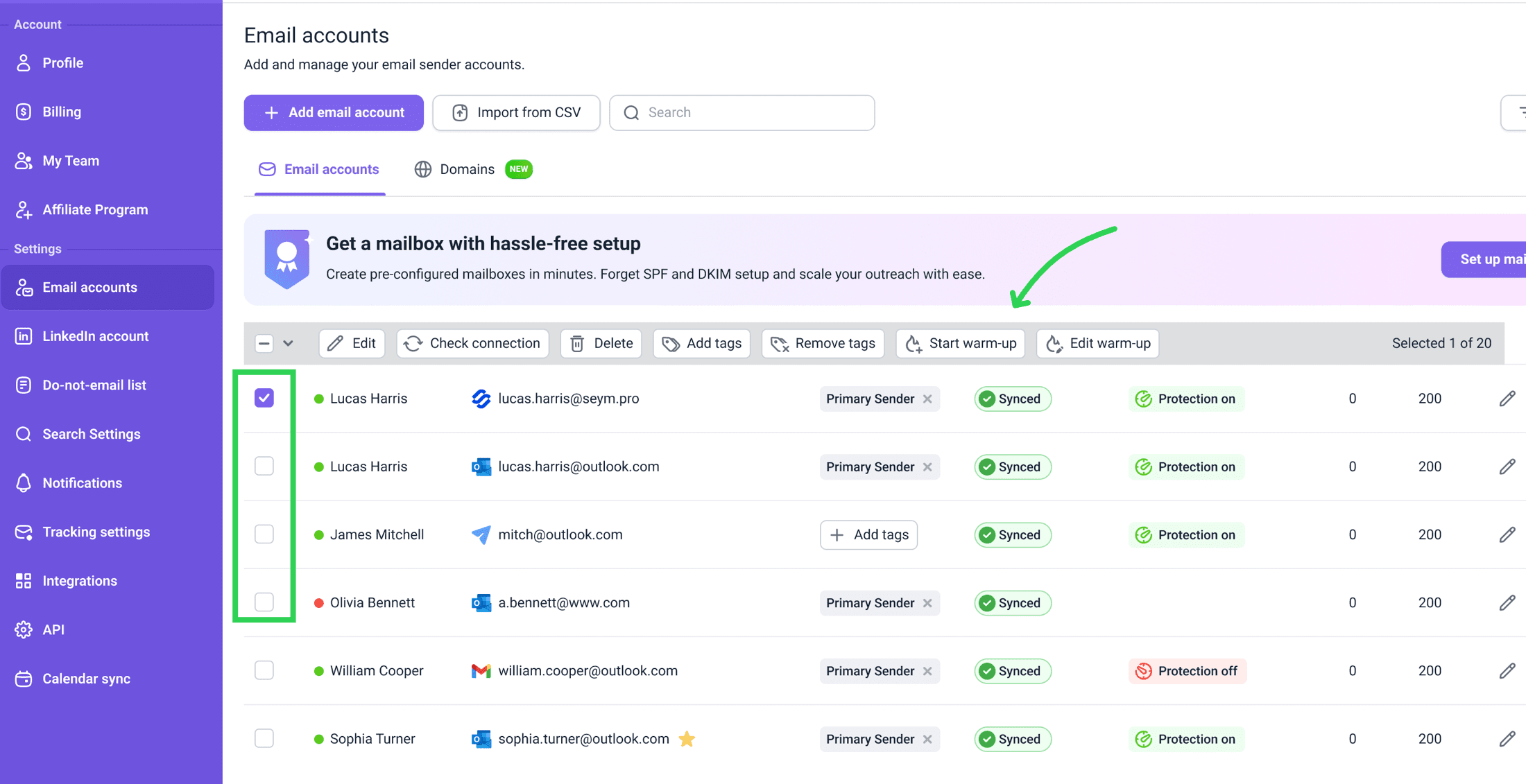 除了连接您现有的帐户外,Snov.io 还提供现成的域名和邮箱服务。