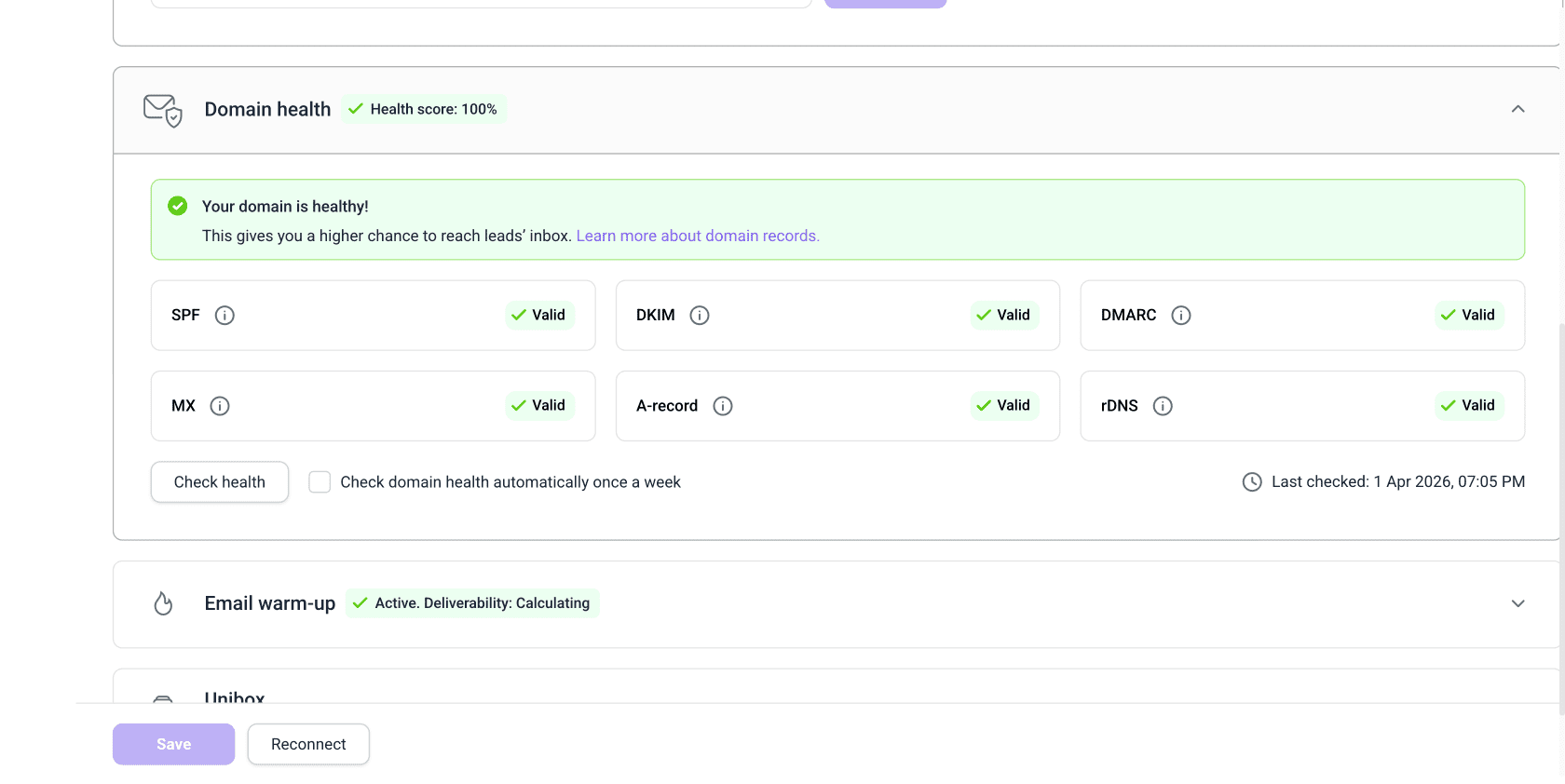 如果帐户显示准备同步状态,说明您可以将其添加到 Unibox。 如果状态显示错误,您可能需要检查该帐户的 IMAP 设置。