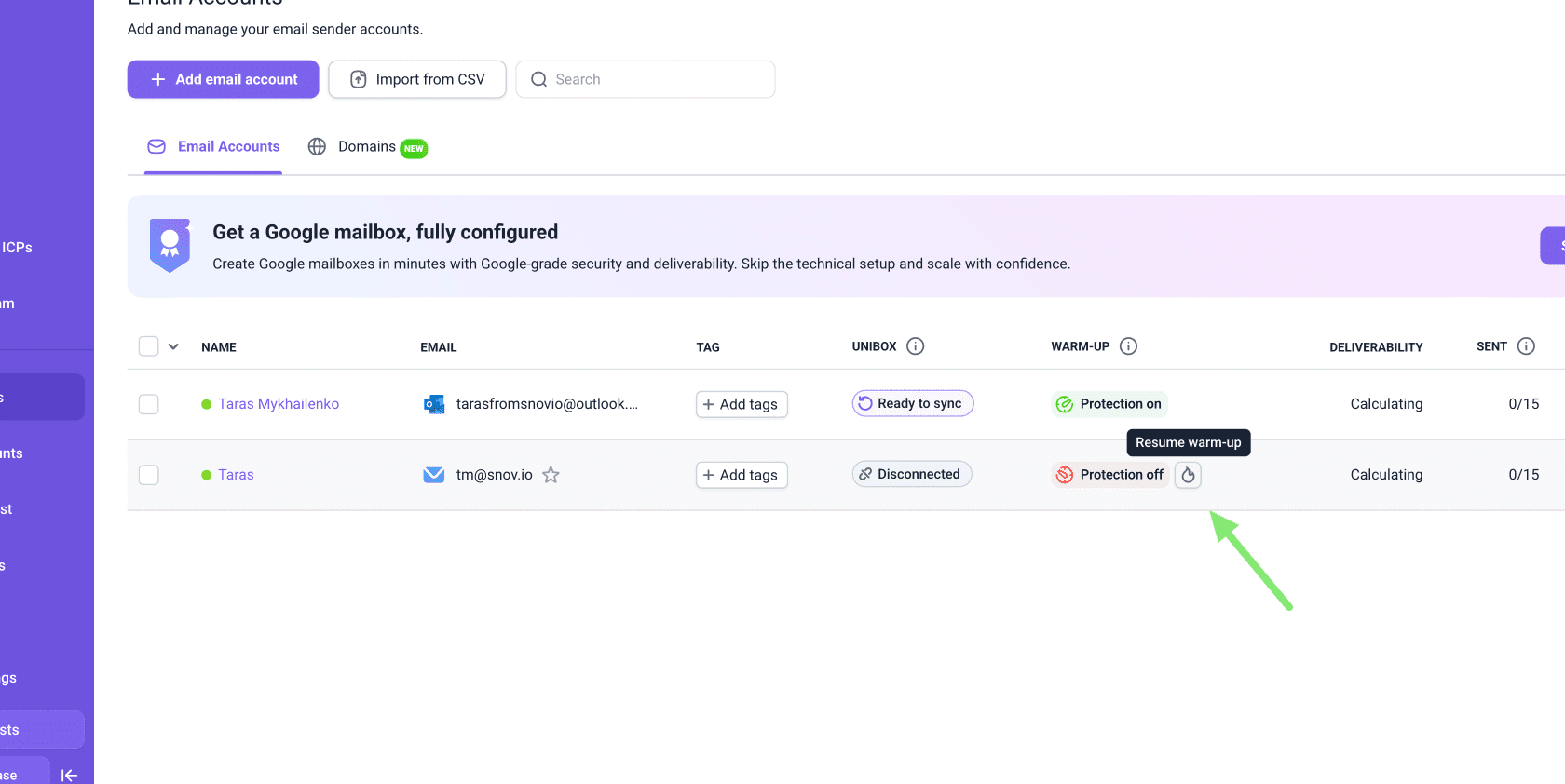 除了连接您现有的帐户外,Snov.io 还提供现成的域名和邮箱服务。