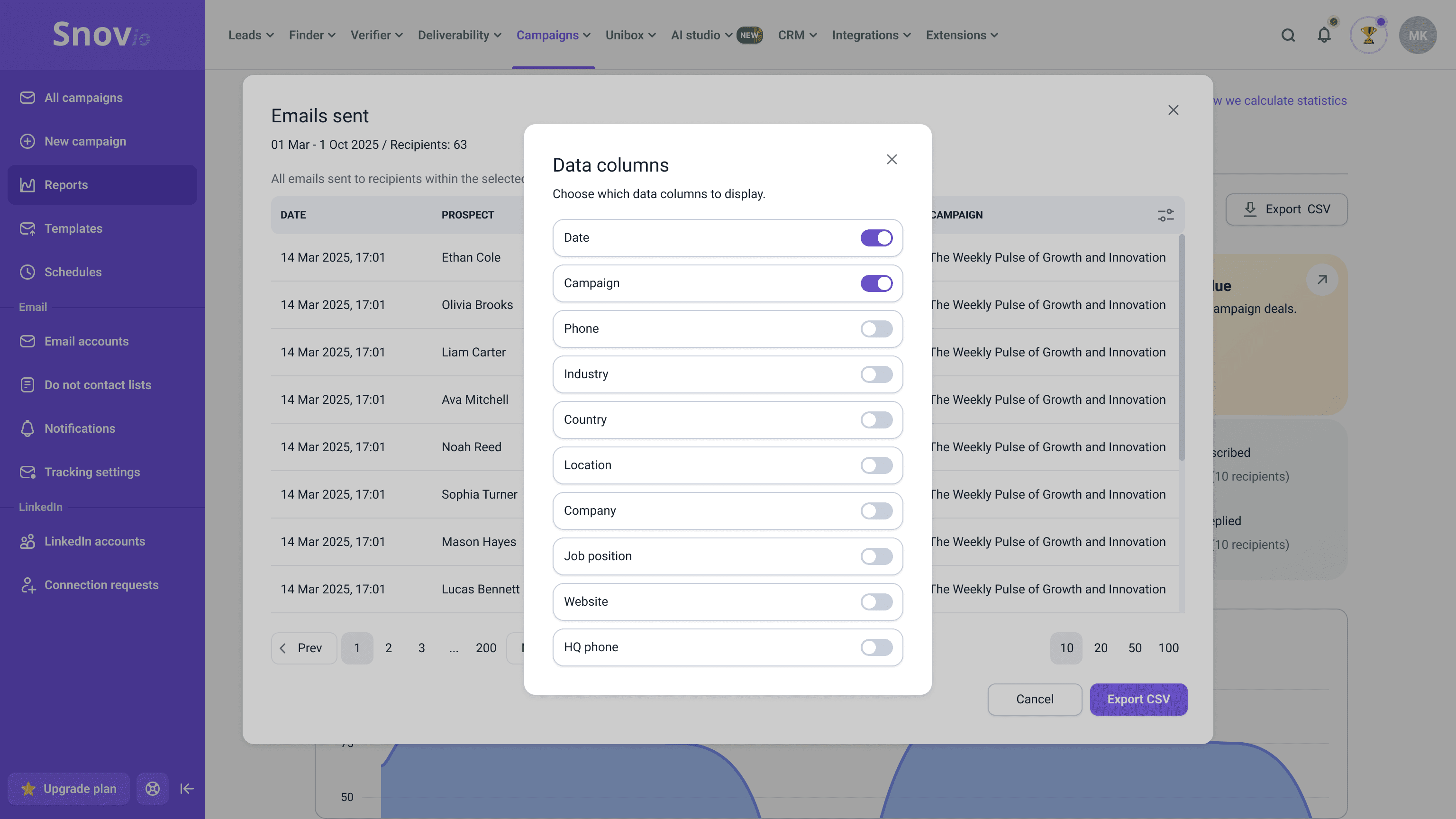 导出选项适用于所有类型的报告——包括邮件、领英和综合报告。要下载报告,请切换到所需的渠道,然后点击右侧的 导出 CSV 按钮。
