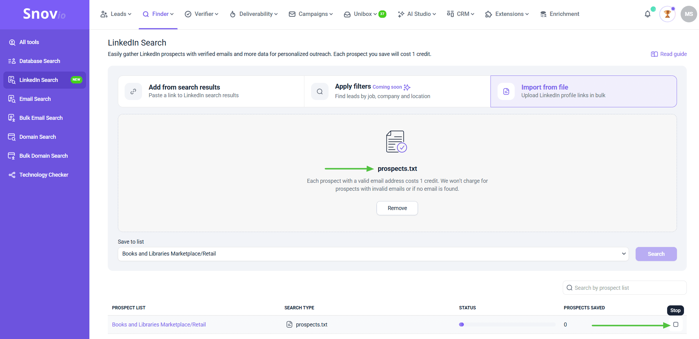 领英搜索功能可与这些工具相辅相成,为您提供更高级的选项,让您可以直接在 Snov.io 帐户中查找来自领英的潜在客户。它提供两种不同的潜在客户查找方式:
