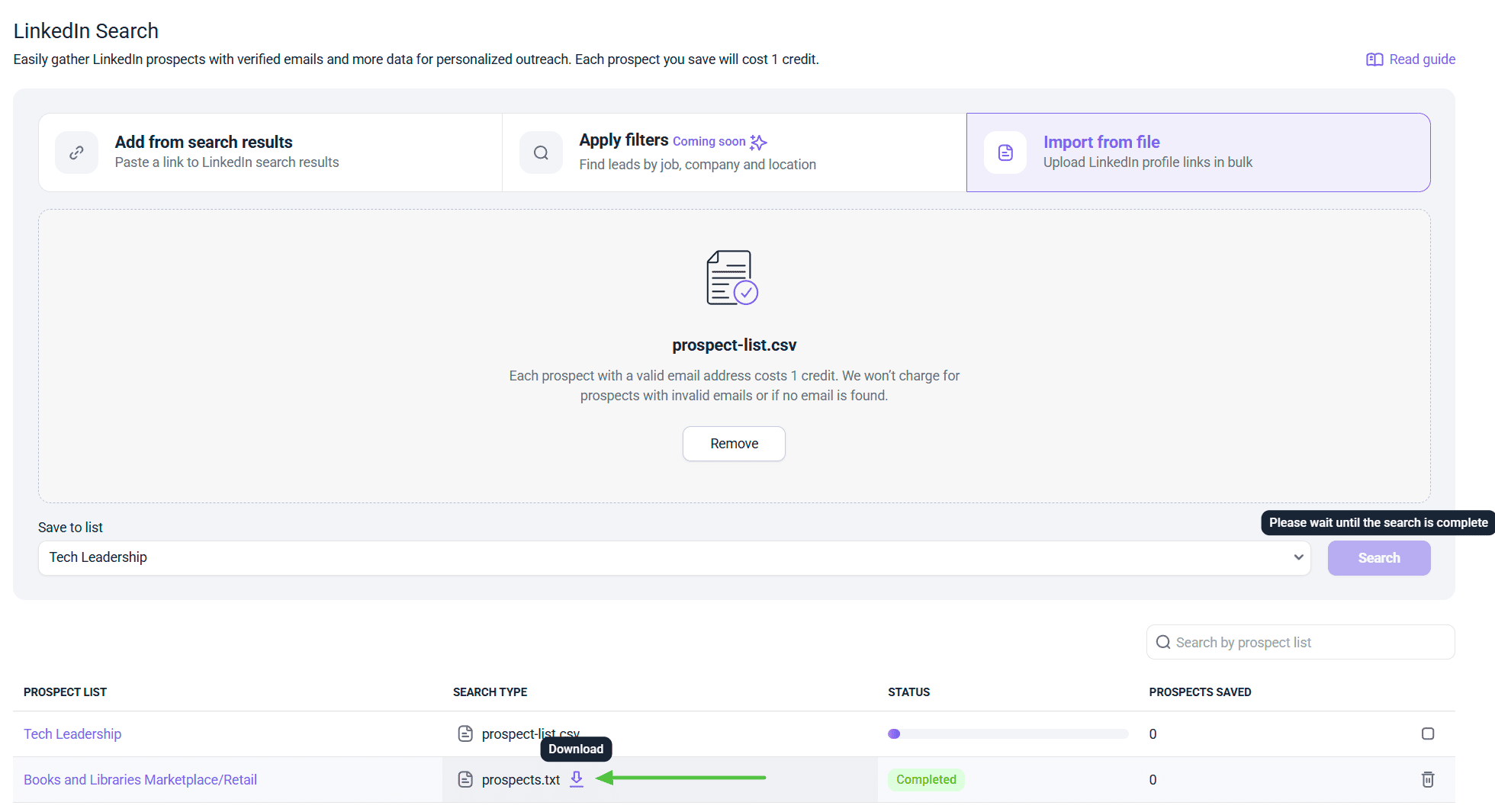 文件上传功能允许您批量搜索潜在客户。