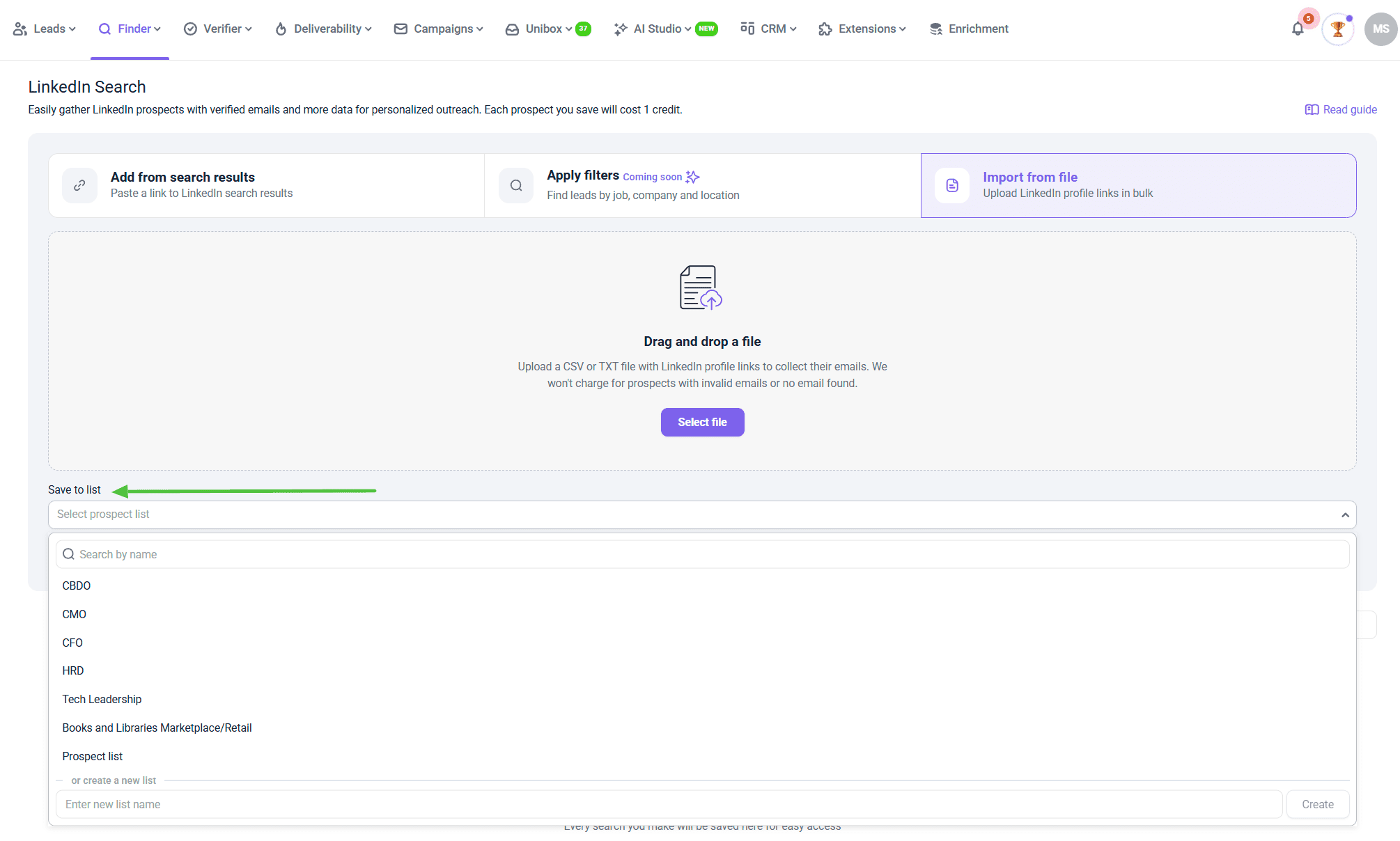 上传潜在客户文件后,请选择一个潜在客户列表来保存搜索结果。如有需要,您也可以从同一个下拉菜单创建新列表。对于电子邮箱地址无效或未找到电子邮箱地址的潜在客户,您无需付费。