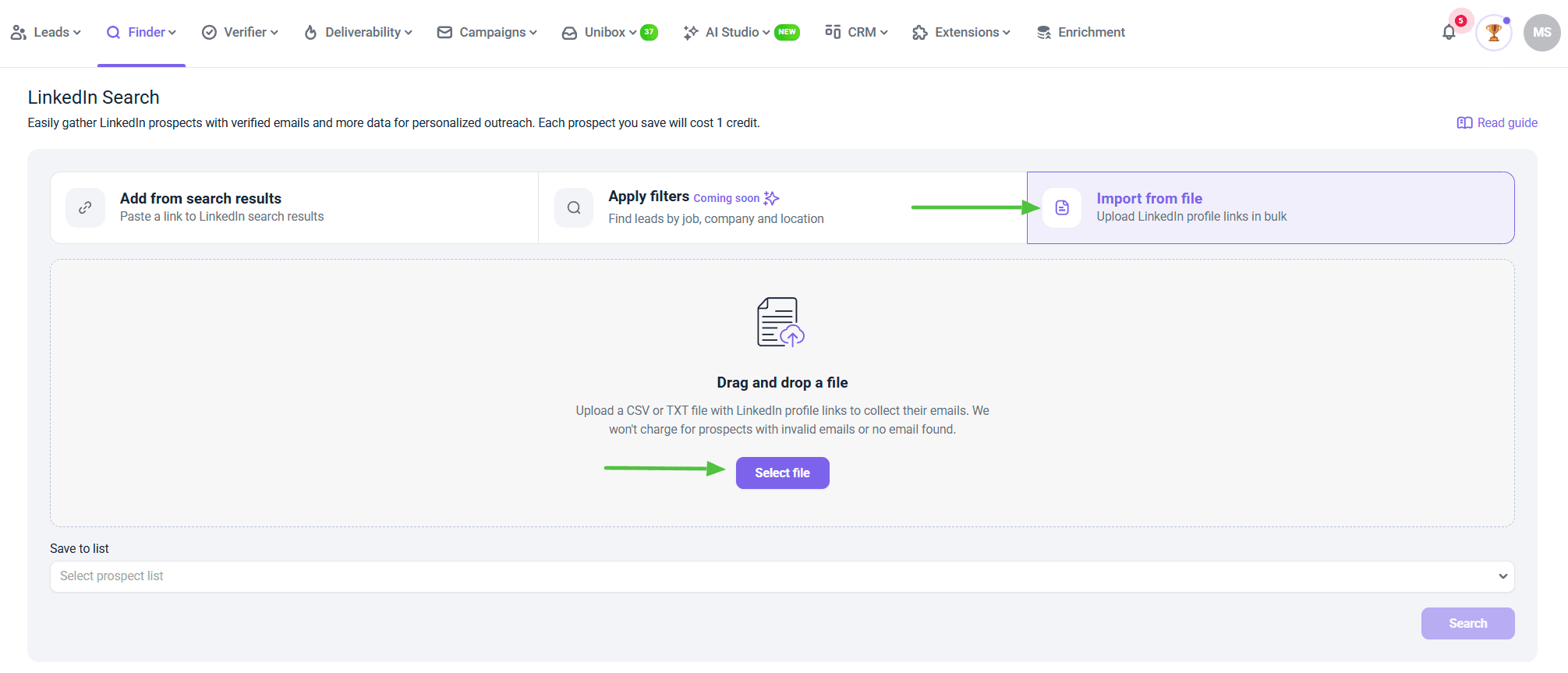 上传包含领英个人资料链接的 CSV 或 TXT 文件,即可收集您的电子邮箱地址。您可以拖放文件,也可以从计算机中选择文件。支持的链接格式为 https://www.linkedin.com/in/prospect-name-ba3821134/