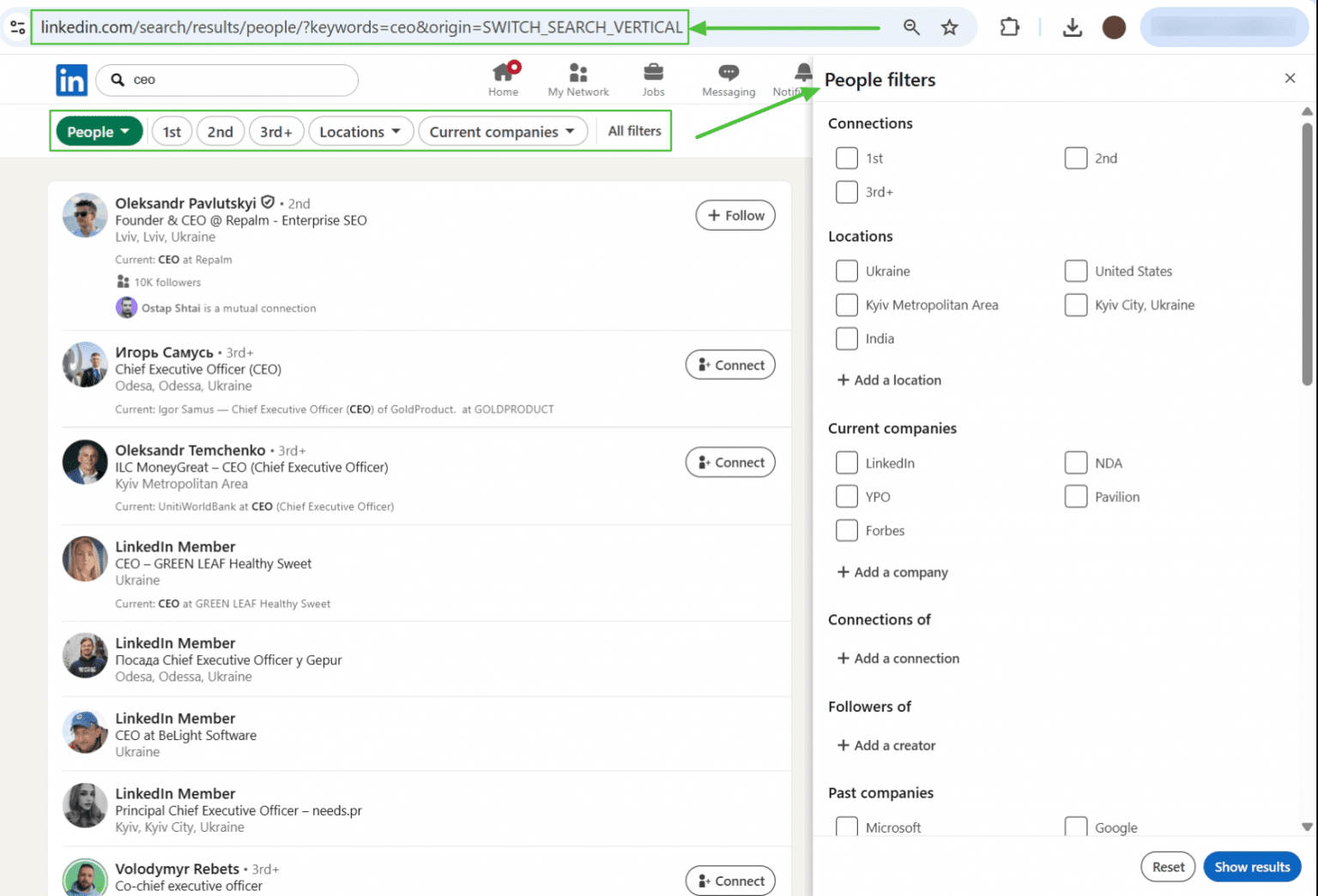 前往领英并输入您的搜索查询。应用必要的筛选条件。
