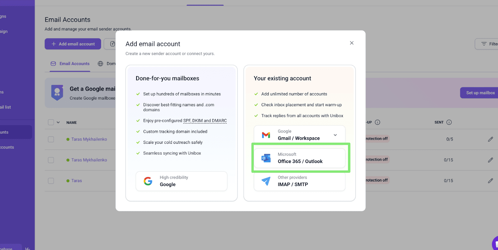将您的微软邮箱添加到 Snov.io,即可将其用于邮件营销、预热和送达率检查。