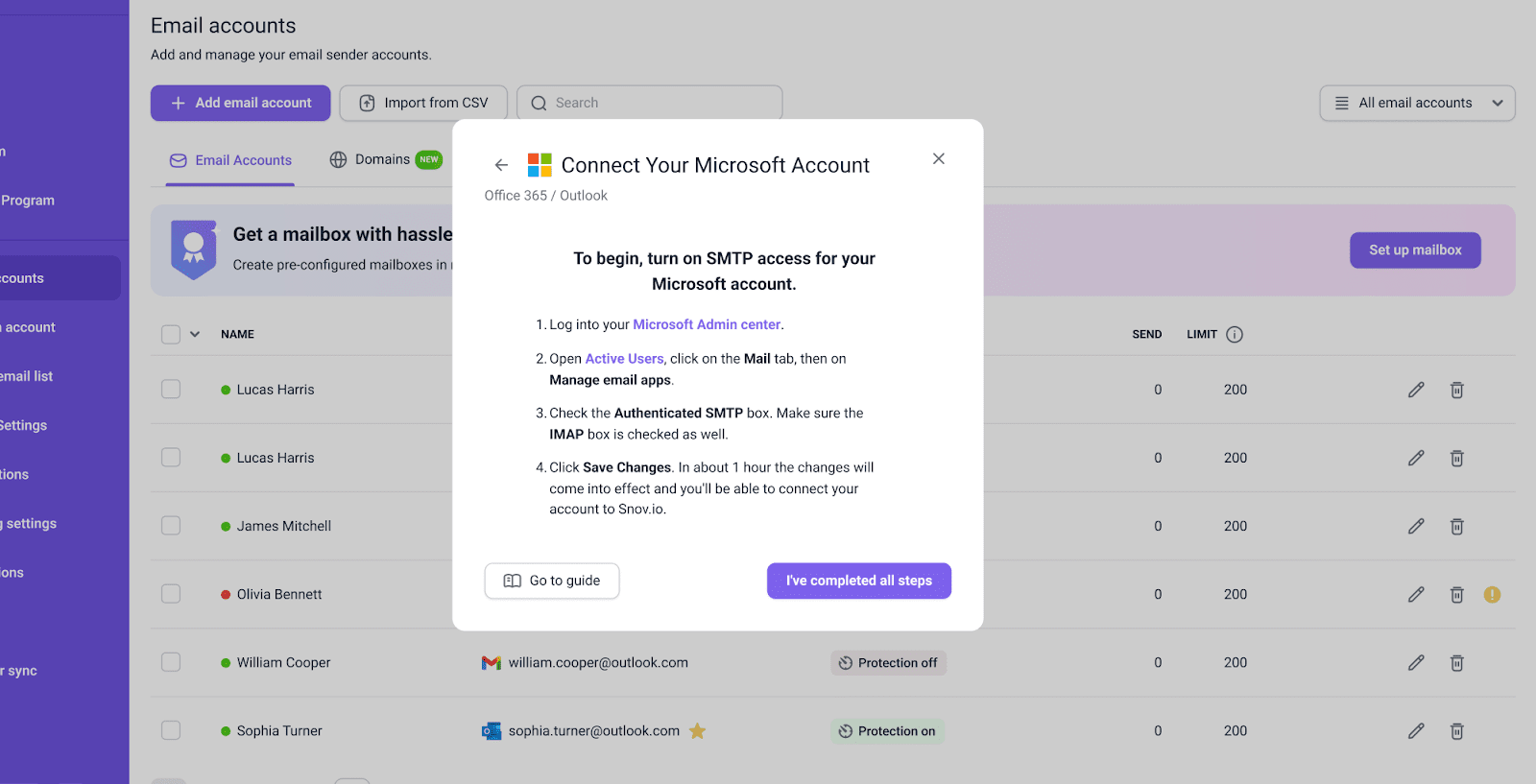 继续操作前,请确保您的 Outlook 帐户已启用 SMTP 访问权限。否则,Snov.io 将无法连接到您的邮箱。