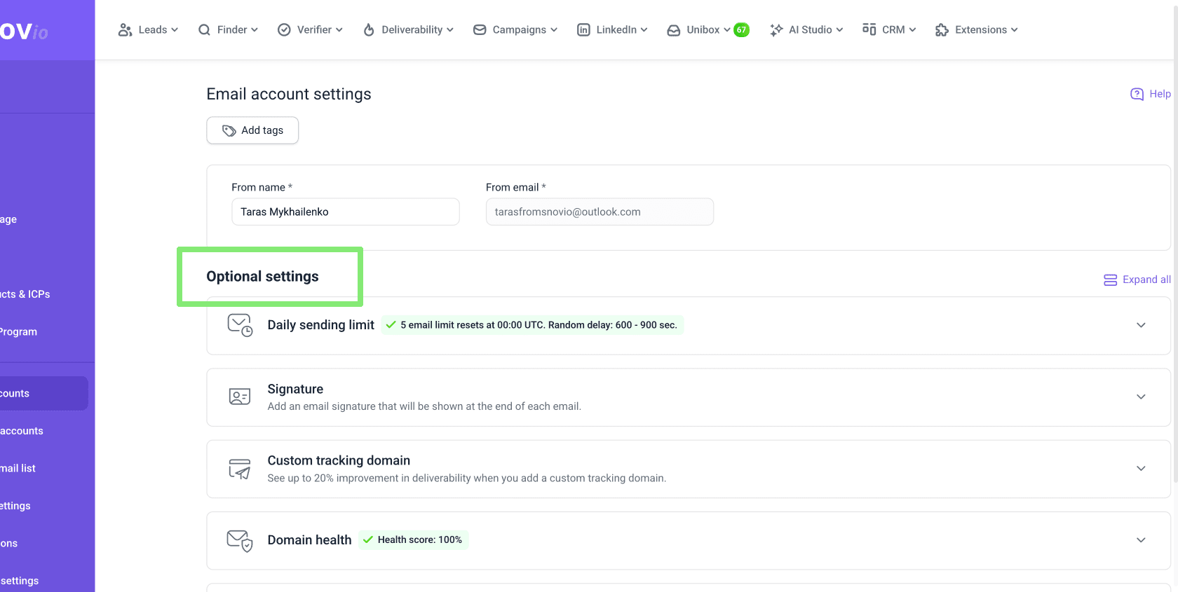 在您的 Snov.io 帐户中,前往电子邮箱帐户页面。您可以在这里管理所有已连接的发件人帐户。