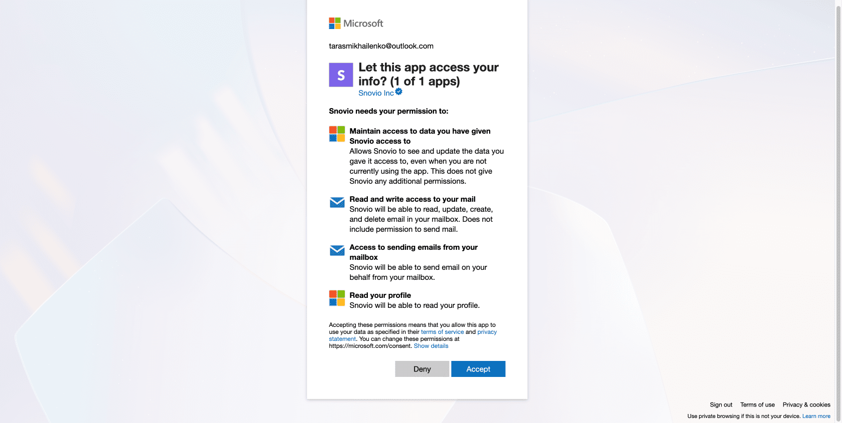 在此步骤中,您需要确认 Snov.io 是否有权使用此 Outlook 帐户。