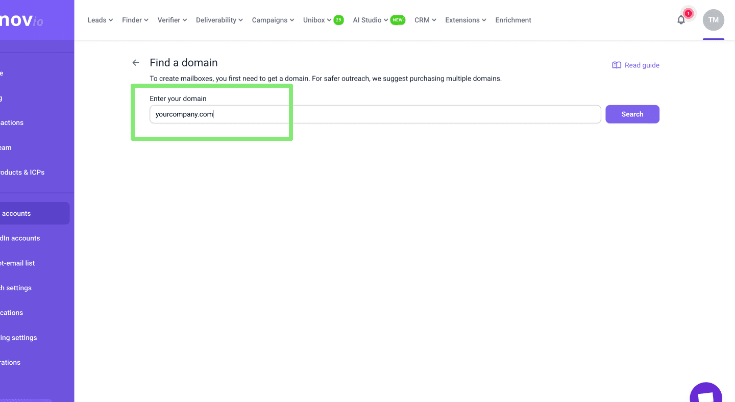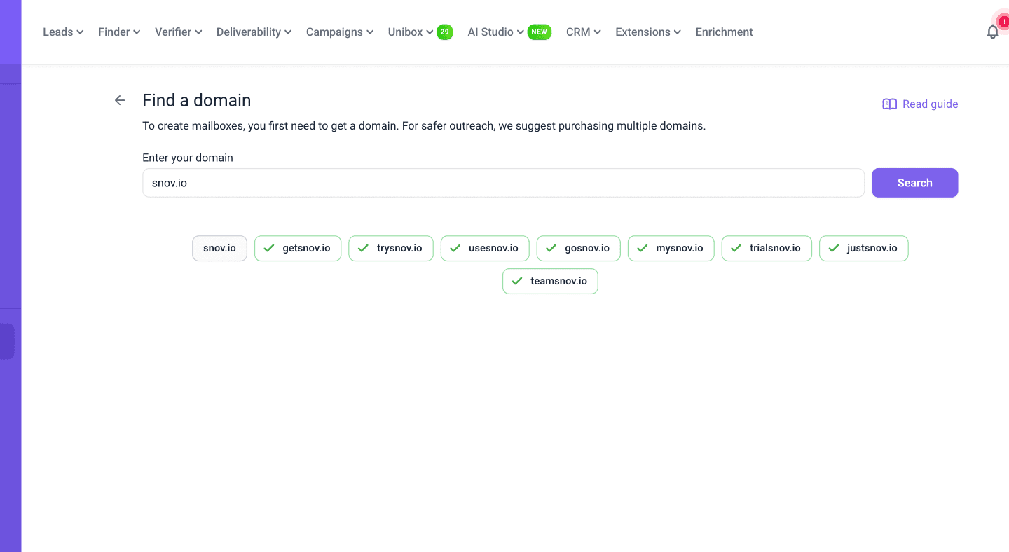 在 Snov.io 中设置 DFY 邮箱帐户,您可以批量创建单独的域名用于主动开发。这些域名会被邮件提供商视为独立域名,因此您的主域名仍然受到保护。
