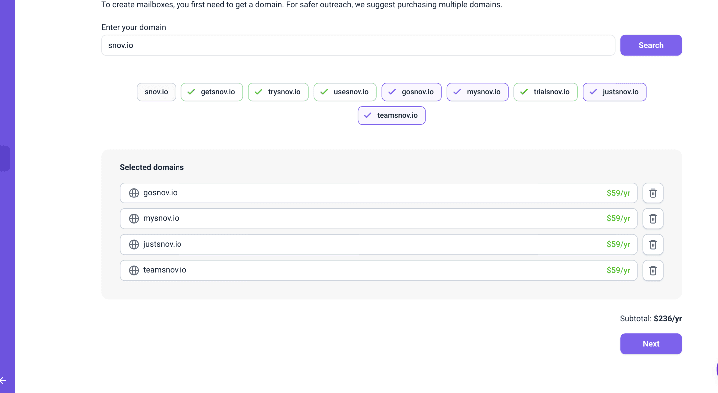 Snov.io 提供多种域名可供设置。查看我们支持的域名 TLD 完整列表。