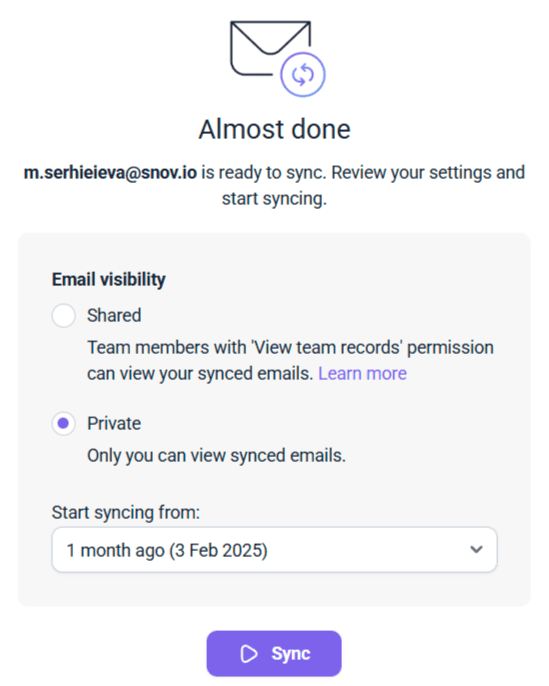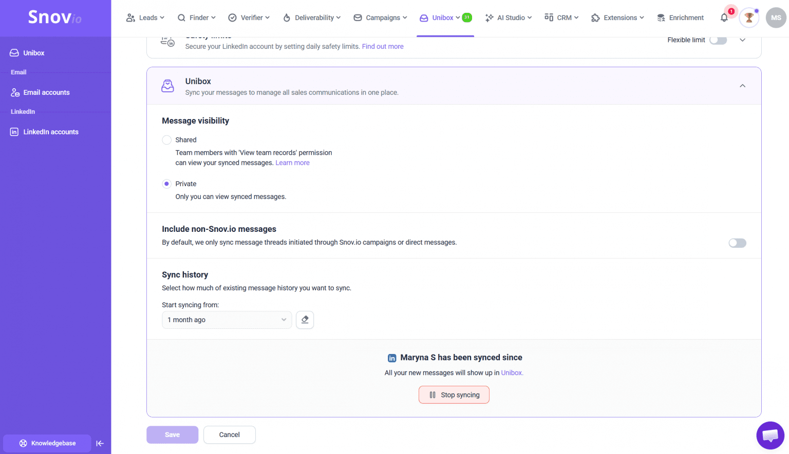 - 禁用此功能后,仅同步通过 Snov.io 活动发起的对话。