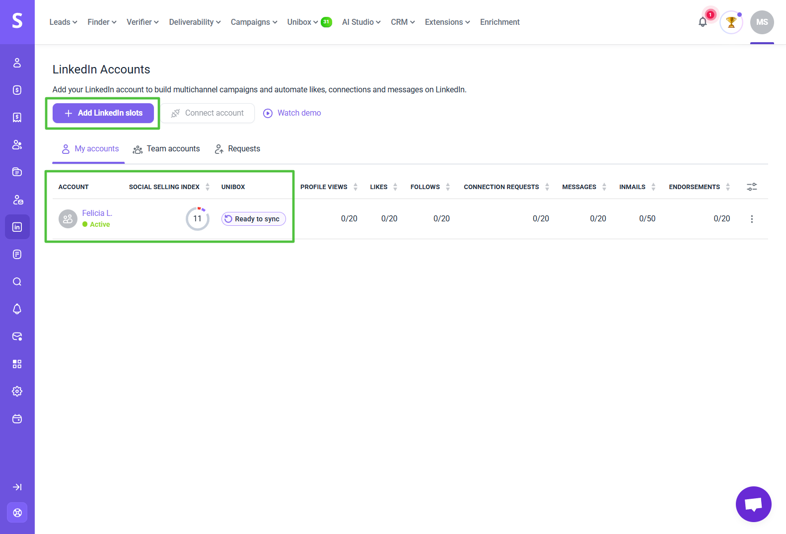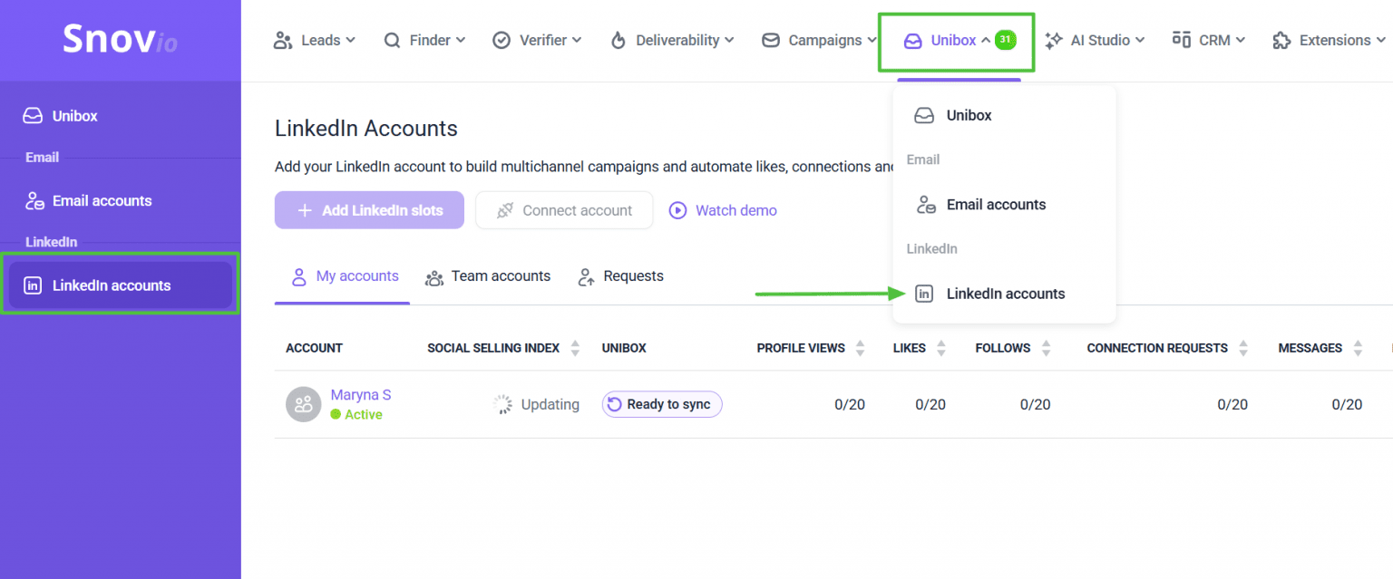 要在 Unibox 中使用领英,您需要一个连接到 Snov.io 的领英帐户。