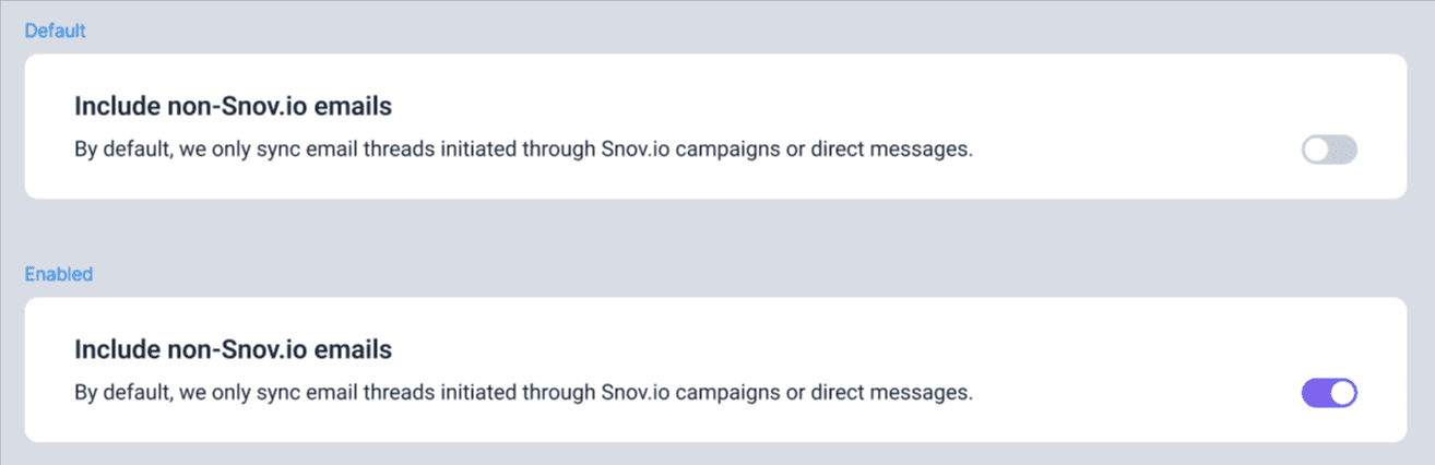 - 关闭(默认):仅同步来自 Snov.io 营销活动和私信消息