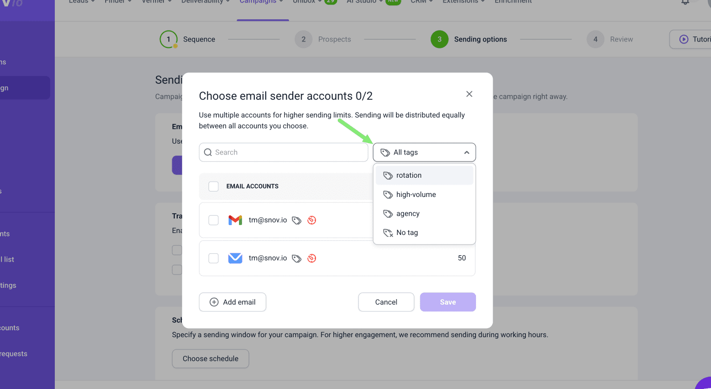 最好将您的邮件发送量分散到多个帐户中以避免这些问题。使用 Snov.io 的邮箱轮换功能,您可以将多个发件人帐户添加到同一个营销活动中。