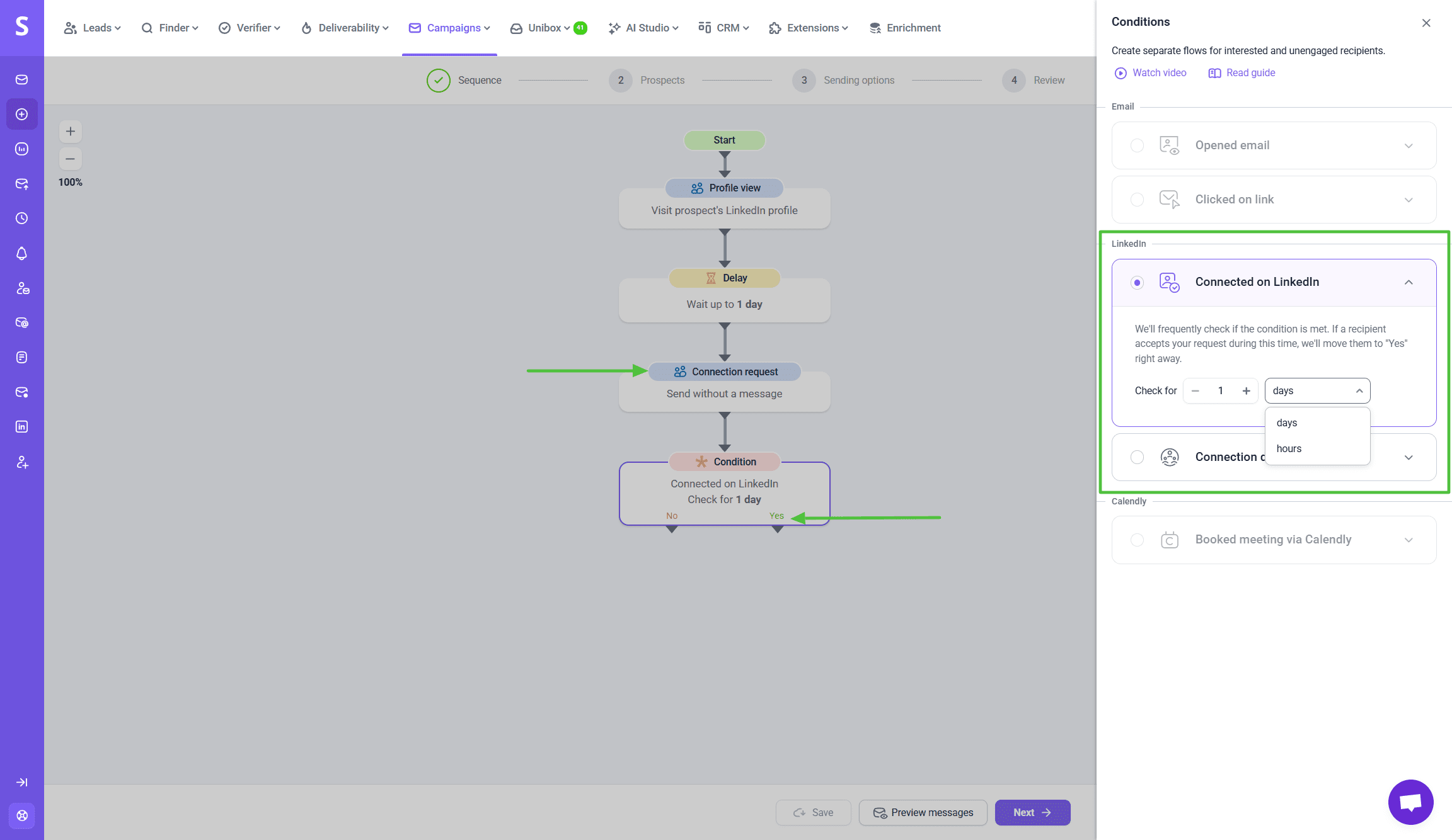 对于回复任何领英消息(连接请求、常规消息或领英站内信)的潜在客户,Snov.io 会自动停止该序列。