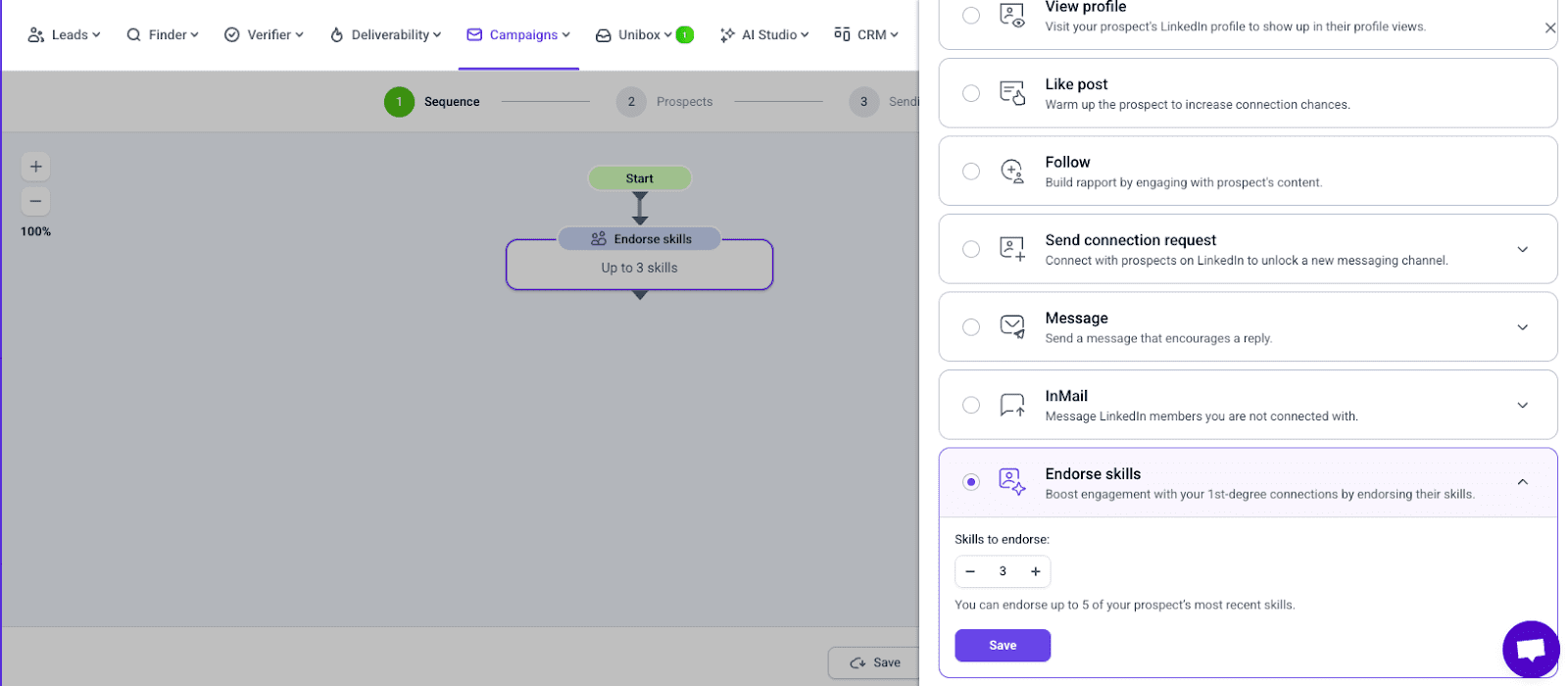 在营销序列编辑器中,添加领英操作,自动执行查看和关注个人资料、点赞帖子以及发送连接请求、消息或领英站内信(InMail)以及技能认可等操作。
