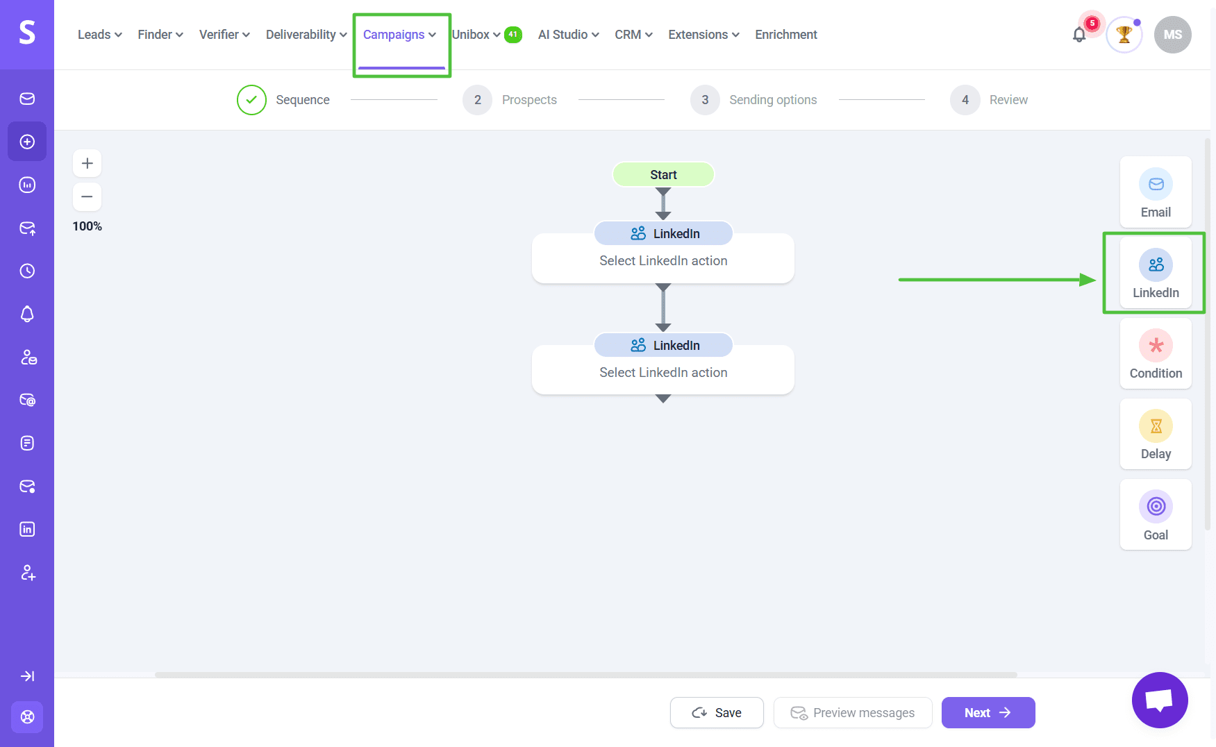 → 在开始本指南之前,请确保你已激活领英附加功能并将领英账户连接到 Snov.io。