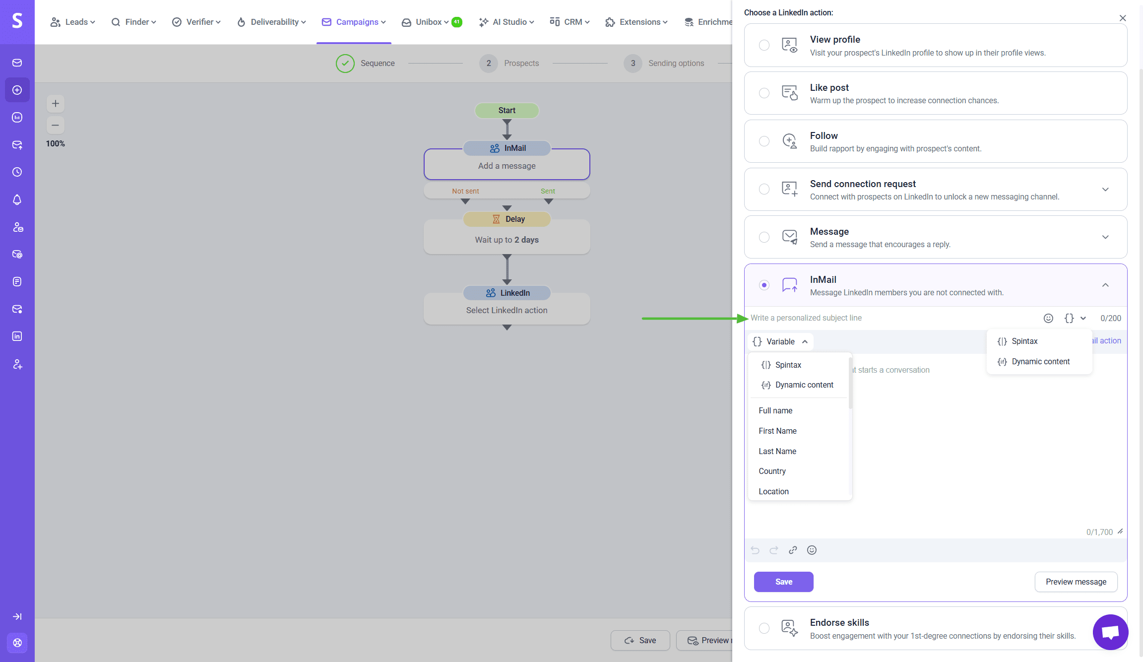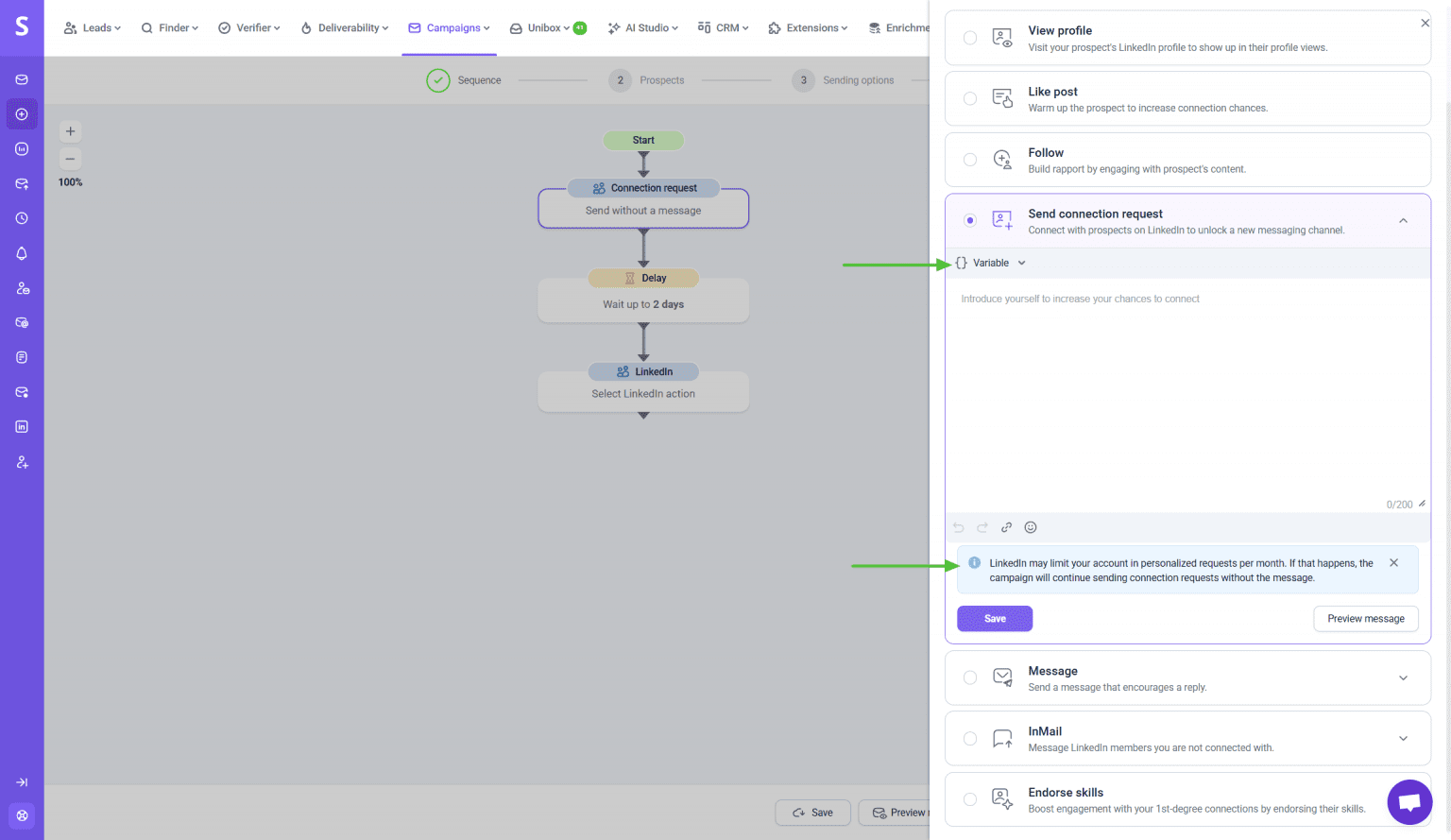 添加一个领英步骤,选择 InMail。用变量个性化,保持简短。