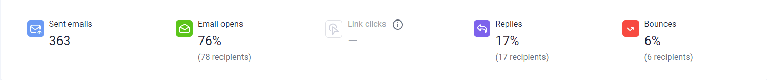 此指标追踪的是至少回复过一次邮件的收件人百分比。较低的回复率(低于 2-3%)表明您的邮件内容或优惠的相关性可能存在问题。了解最佳实践,以提高回复率。