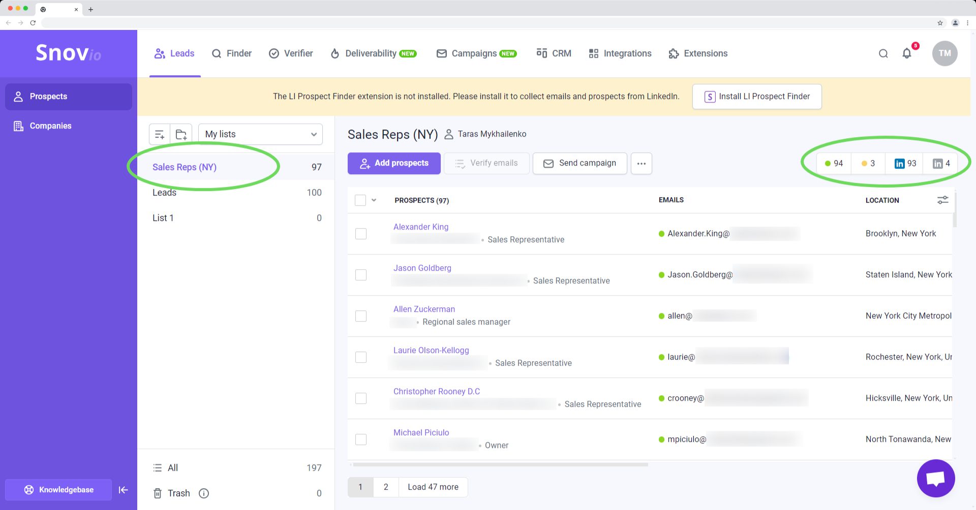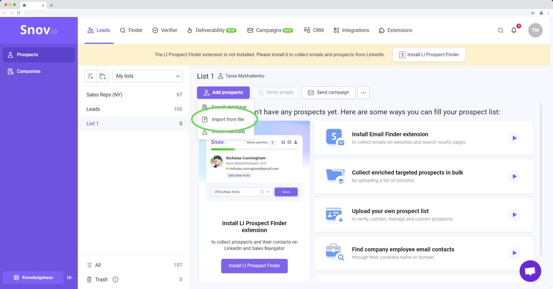 除了导入功能外,Snov.io 还提供功能全面的潜在客户开发工具,几乎涵盖所有寻找潜在客户的方法。此外,我们会自动验证您保存的所有潜在客户信息,因此您无需购买额外的验证工具。