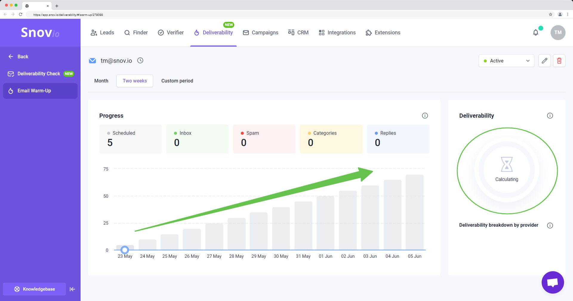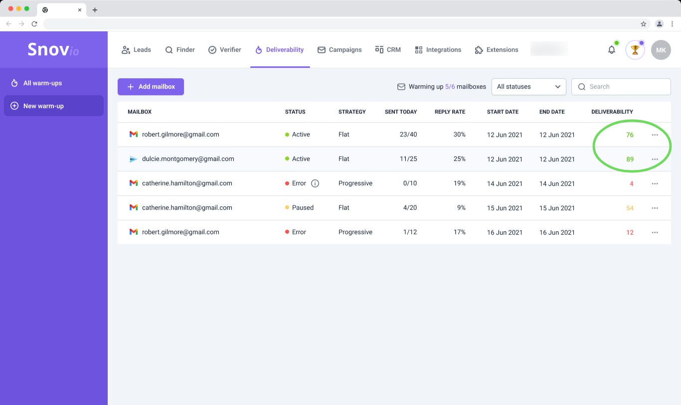 如果您要使用信誉受损的现有账户,我们的预热功能可以帮助恢复其信誉并防止未来出现问题。Snov.io 只需两周即可提升此类账户的邮件送达率。