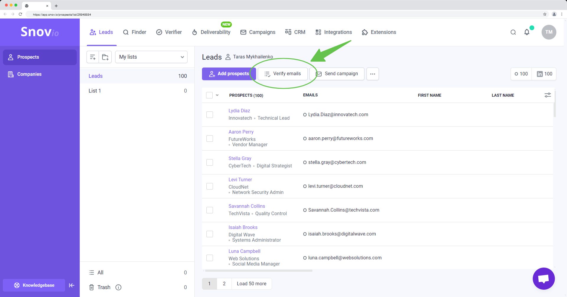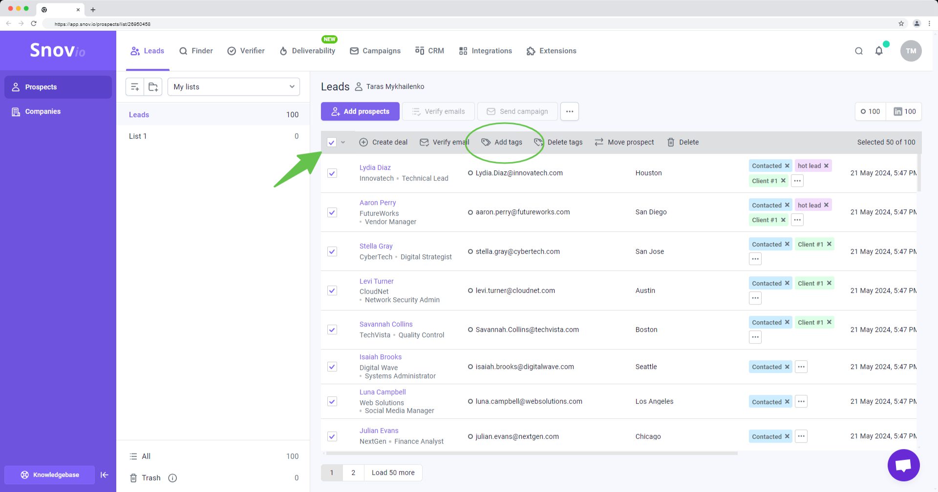 您账户中的潜在客户页面是您存储和管理潜在客户列表的工作区。您还可以在这里导入潜在客户、验证邮箱、清理列表、筛选和导出潜在客户。
