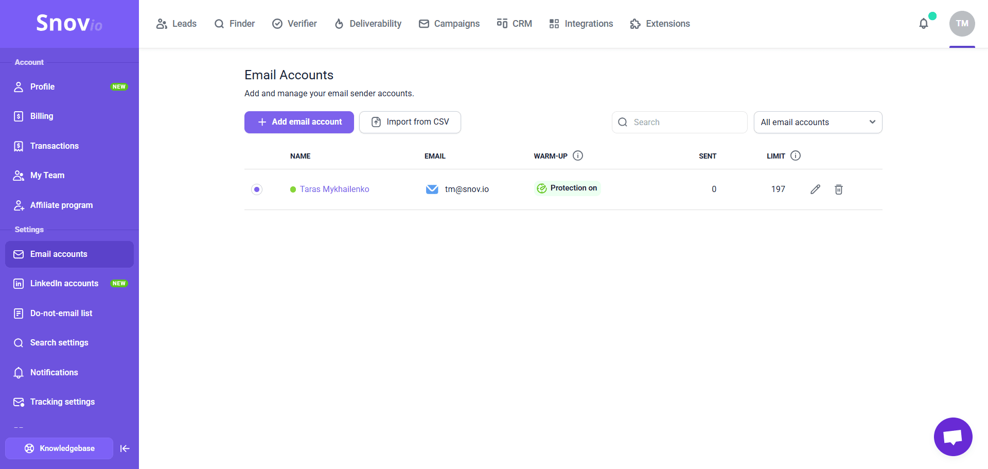 为了加快设置过程,您可以使用“从 CSV 导入”选项批量添加电子邮件帐户。您需要上传一个包含 SMTP/IMAP 设置的 CSV 文件,Snov.io 将根据文件中的数据自动配置电子邮件发件人。一次导入最多可添加 100 个电子邮件帐户。了解更多关于 CSV 文件要求的信息。