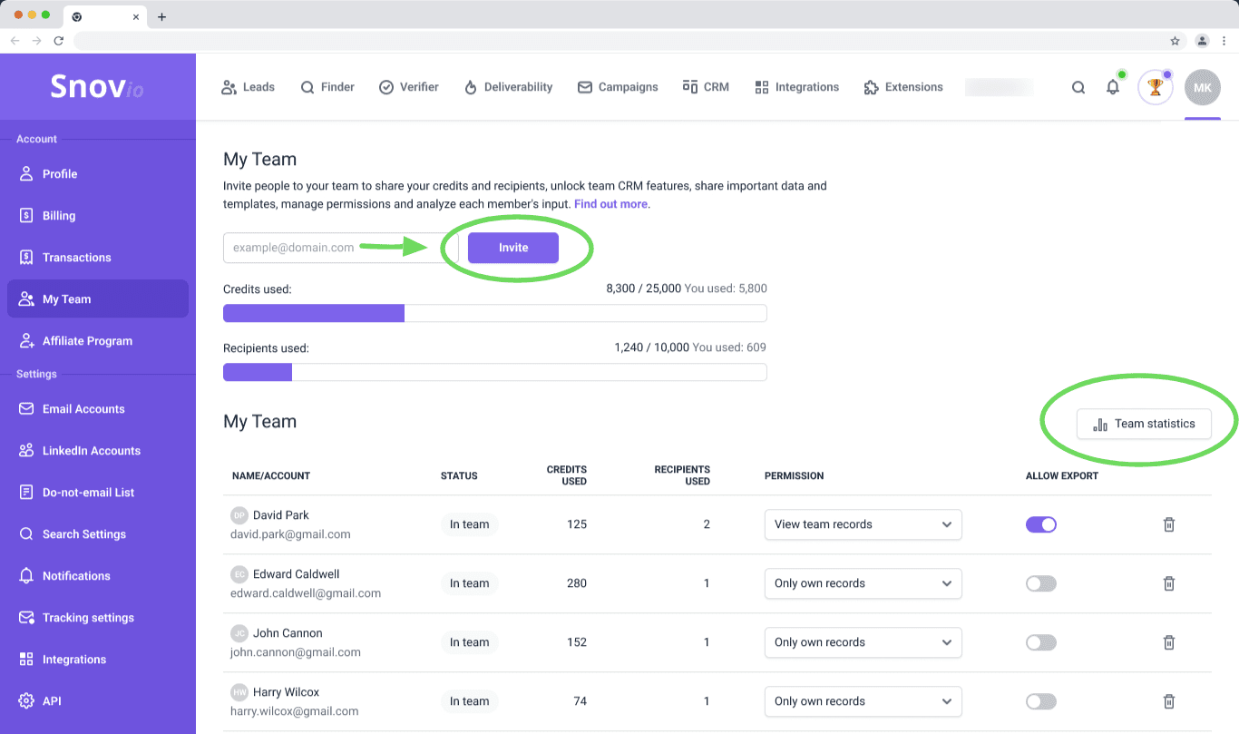 您添加到团队的帐户将使用分配给管理员付费帐户的配额(点数、收件人、预热名额、领英帐户名额)。每个团队成员(客户帐户)也将拥有与管理员相同的功能,包括自己的潜在客户存储、营销活动和报告。