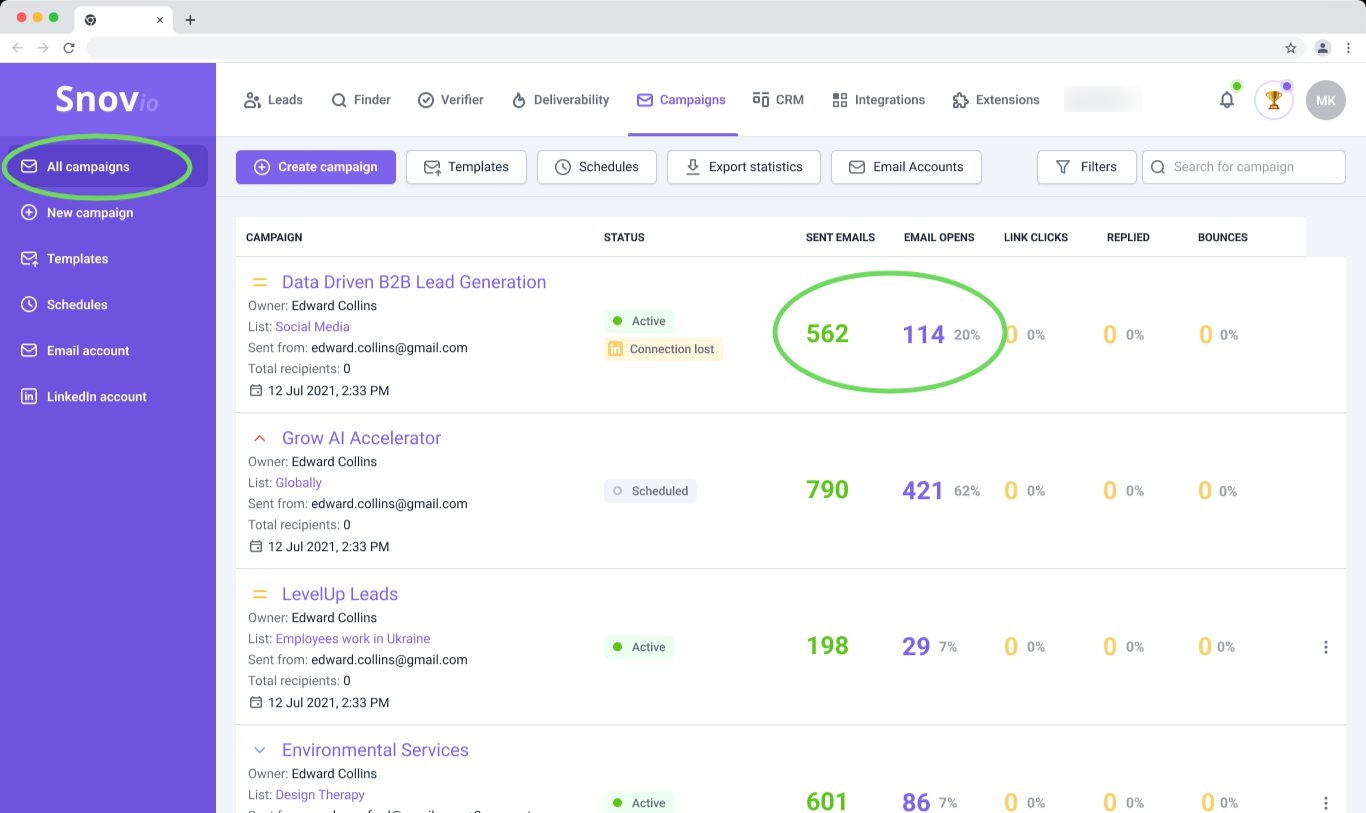 在您管理账户和开展营销活动的同时,Snov.io 会收集统计数据并将其转化为切实可行的分析报告。在您的账户中,您将拥有一个专属的分析仪表板,用于查看和导出账户及营销活动的效果报告。