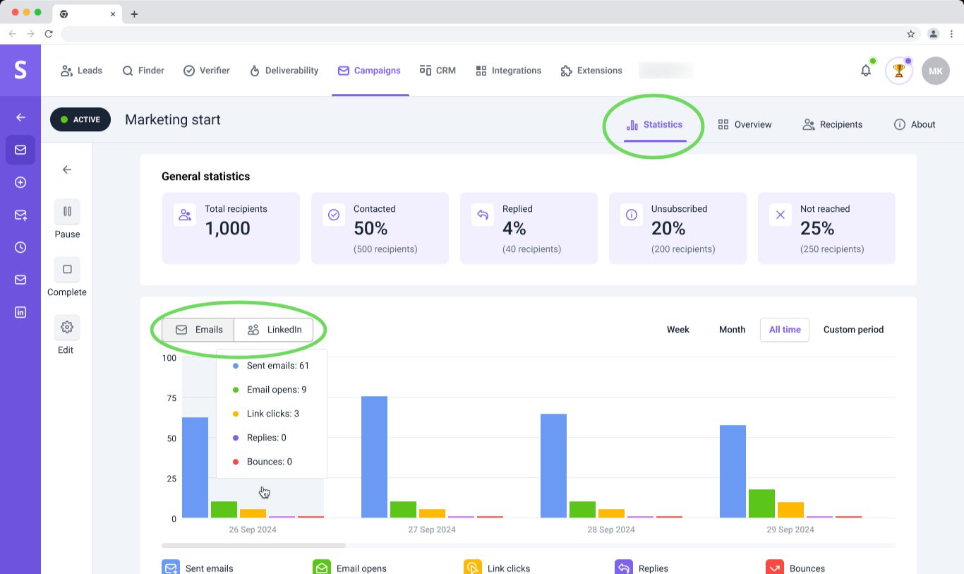 在营销活动的“统计”选项卡上,您可以跟踪每个渠道(电子邮件和领英)的所有重要 KPI,并分析已完成活动的指标。