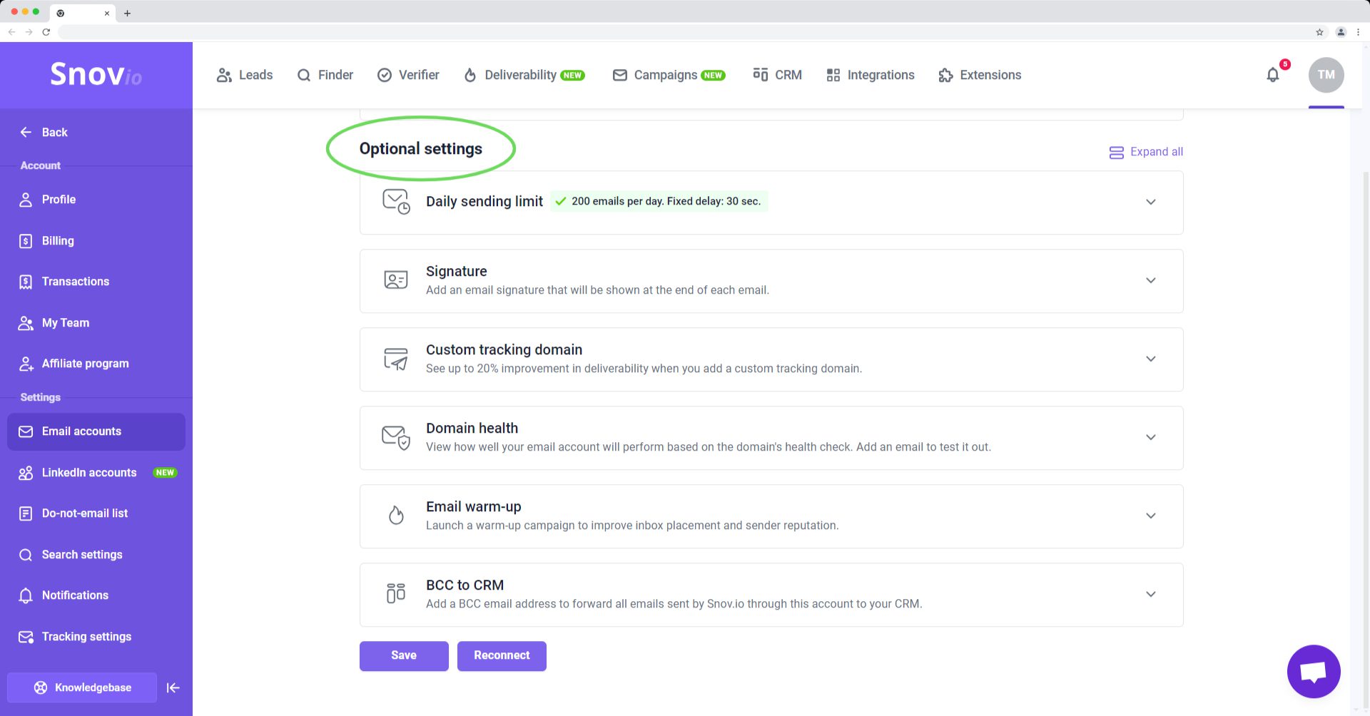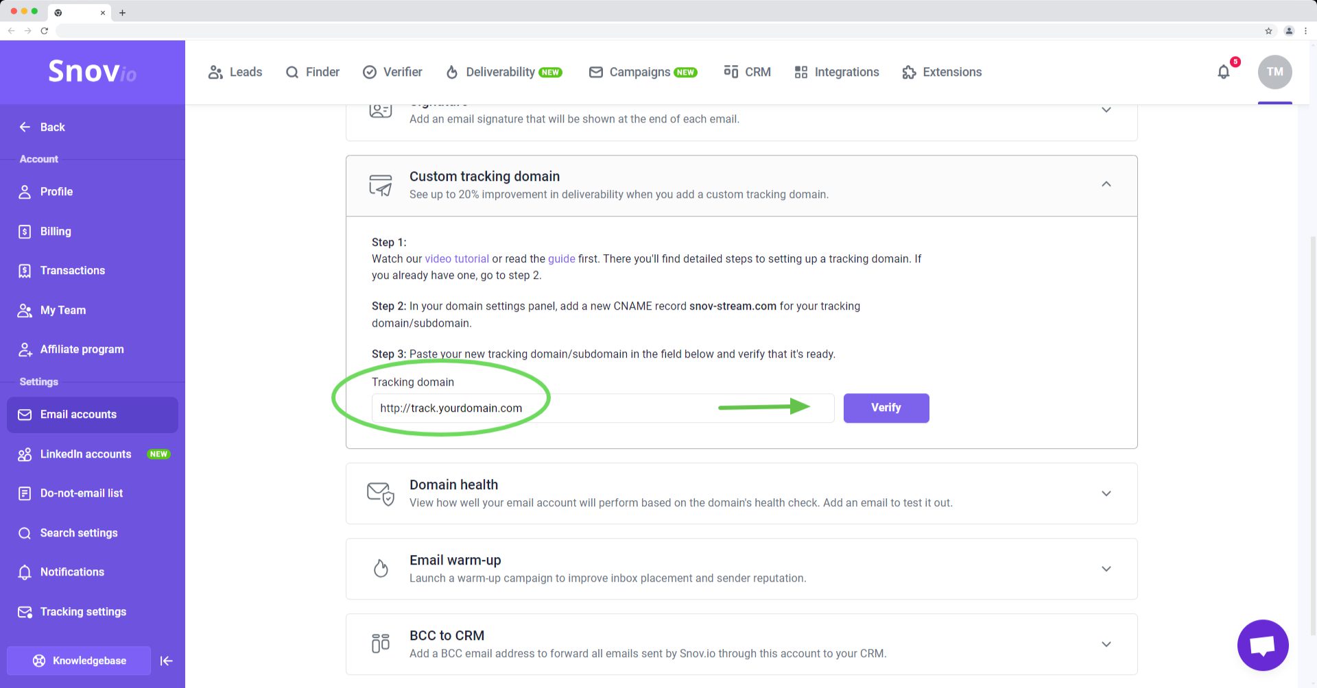 这是确保邮件送达率达到积极效果的重要一步;在 Snov.io 中,您可以将自定义跟踪域附加到每个发件人帐户。