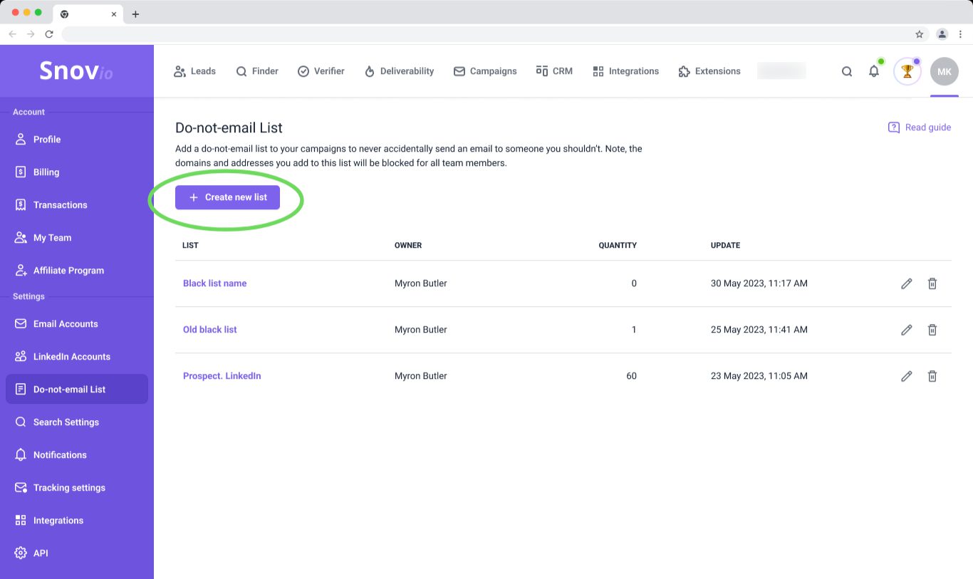 在为客户管理营销活动时,确保邮件仅送达目标收件人至关重要。为了解决这个问题,Snov.io 提供了“禁止发送列表” 功能。您可以使用此选项上传电子邮件联系人/域名列表,阻止他们接收营销活动邮件。