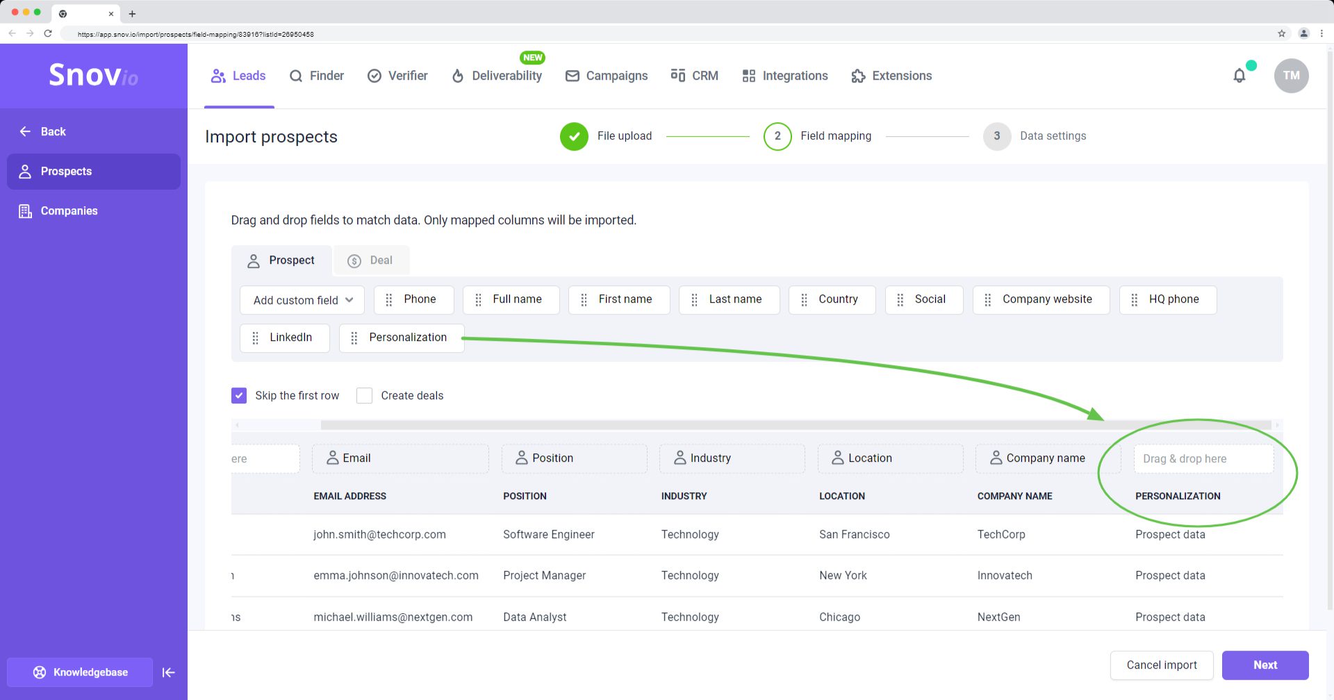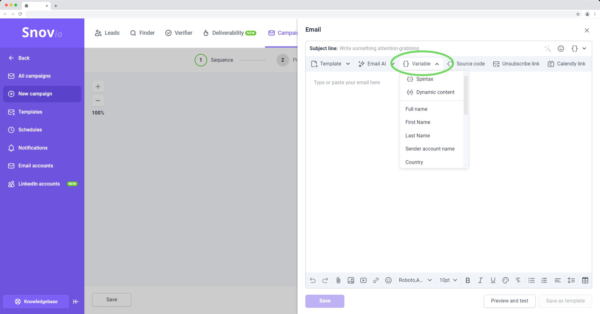 在 Snov.io 营销活动中,您可以利用潜在客户数据自动批量个性化电子邮件。这可以通过插入与潜在客户数据字段相对应的变量来实现。